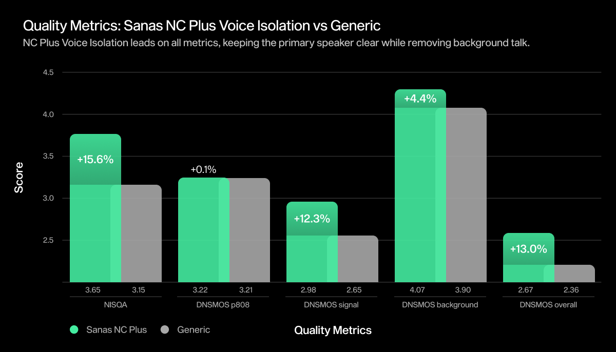 - Next-Generation Performance: Powered by a new AI model, Noise Cancellation Plus delivers breakthrough gains in both objective metrics and perceptual quality compared with prior Sanas models and the leading solutions on the market.