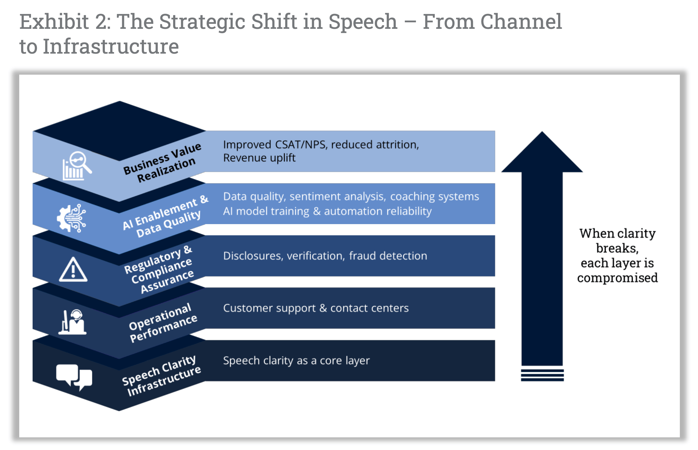 As shown in Exhibit 2, this shift involves more than better headsets or noise suppression. It’s about treating clarity as infrastructure, built into the voice layer, embedded in compliance and AI pipelines, and designed to reduce friction across every spoken interaction.