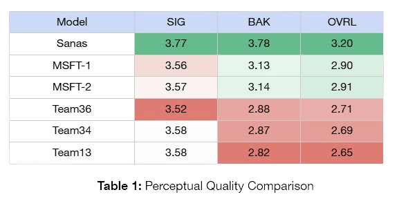 Sanas achieved the highest scores across all three categories, outperforming every official submission from the 2023 challenge, including both Microsoft baselines. These results demonstrate the superior perceptual quality of Sanas’ model in real-world scenarios.